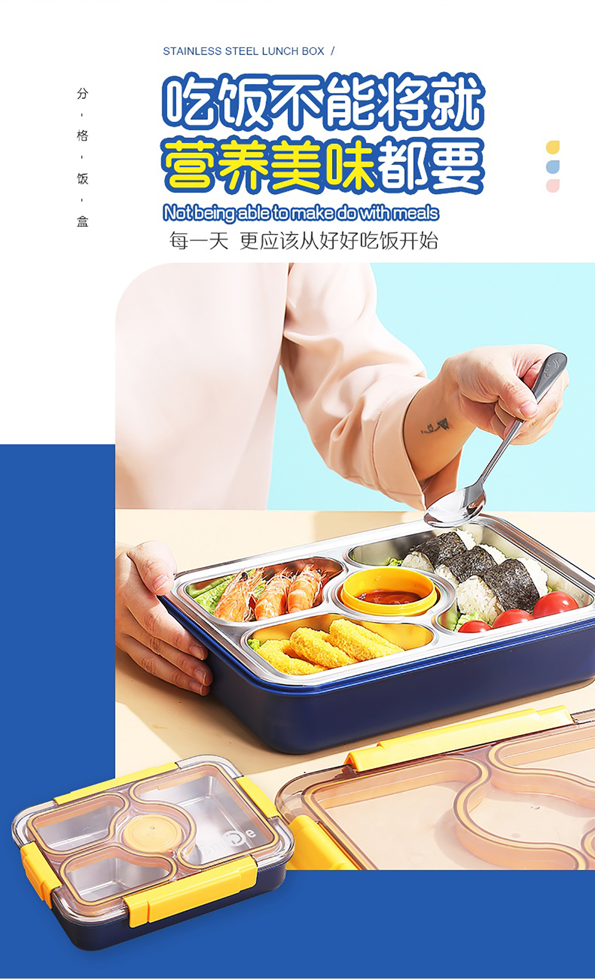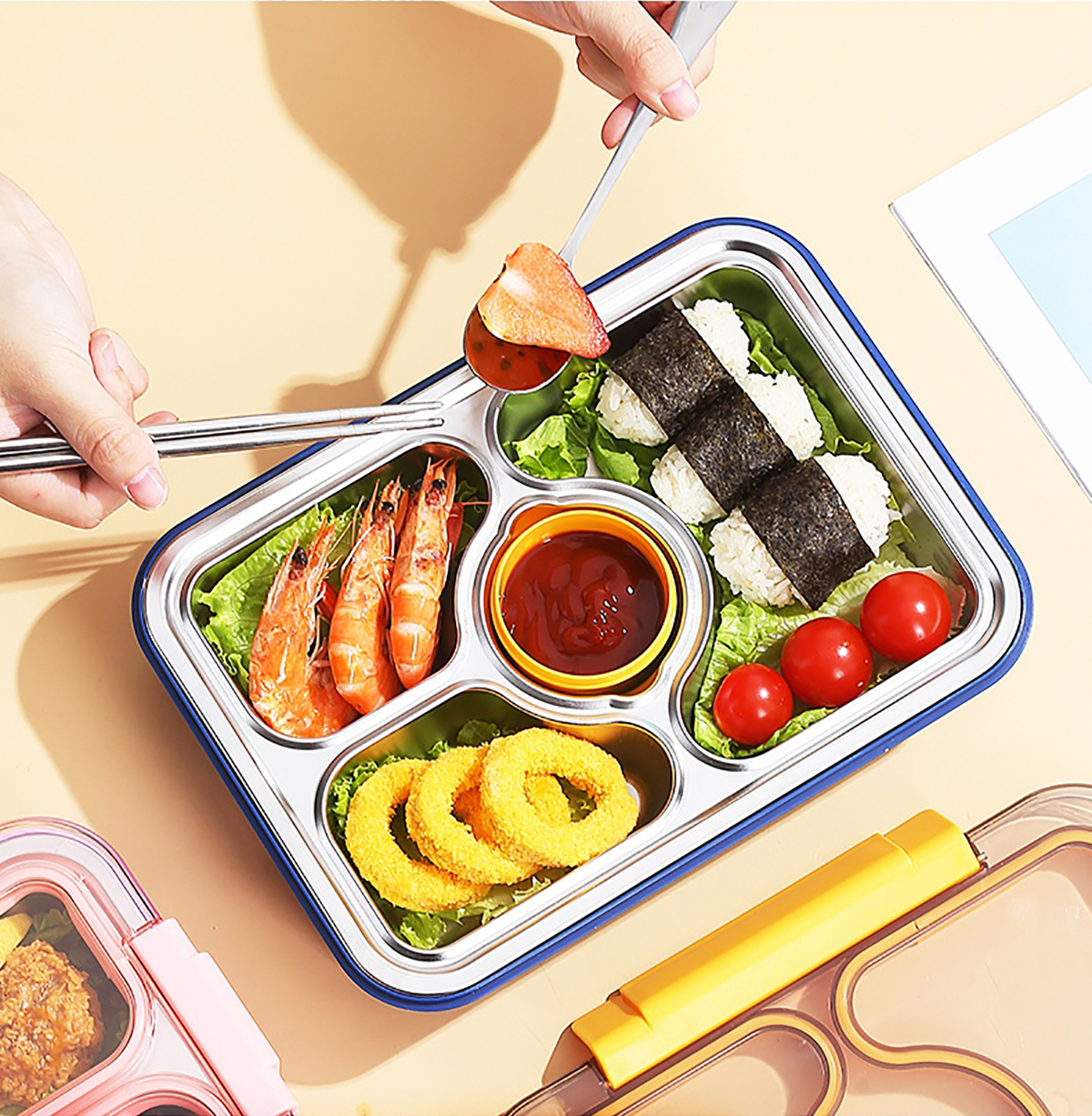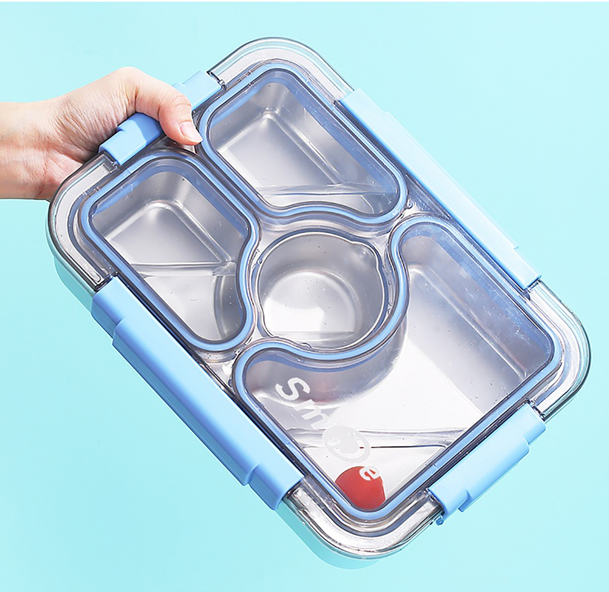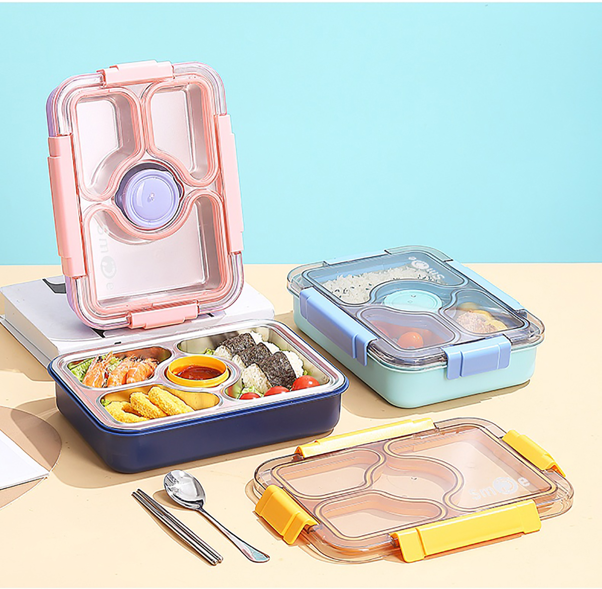 950ml獨立密封不銹鋼餐盒(3格+PP碗80ml+不銹鋼勺筷)