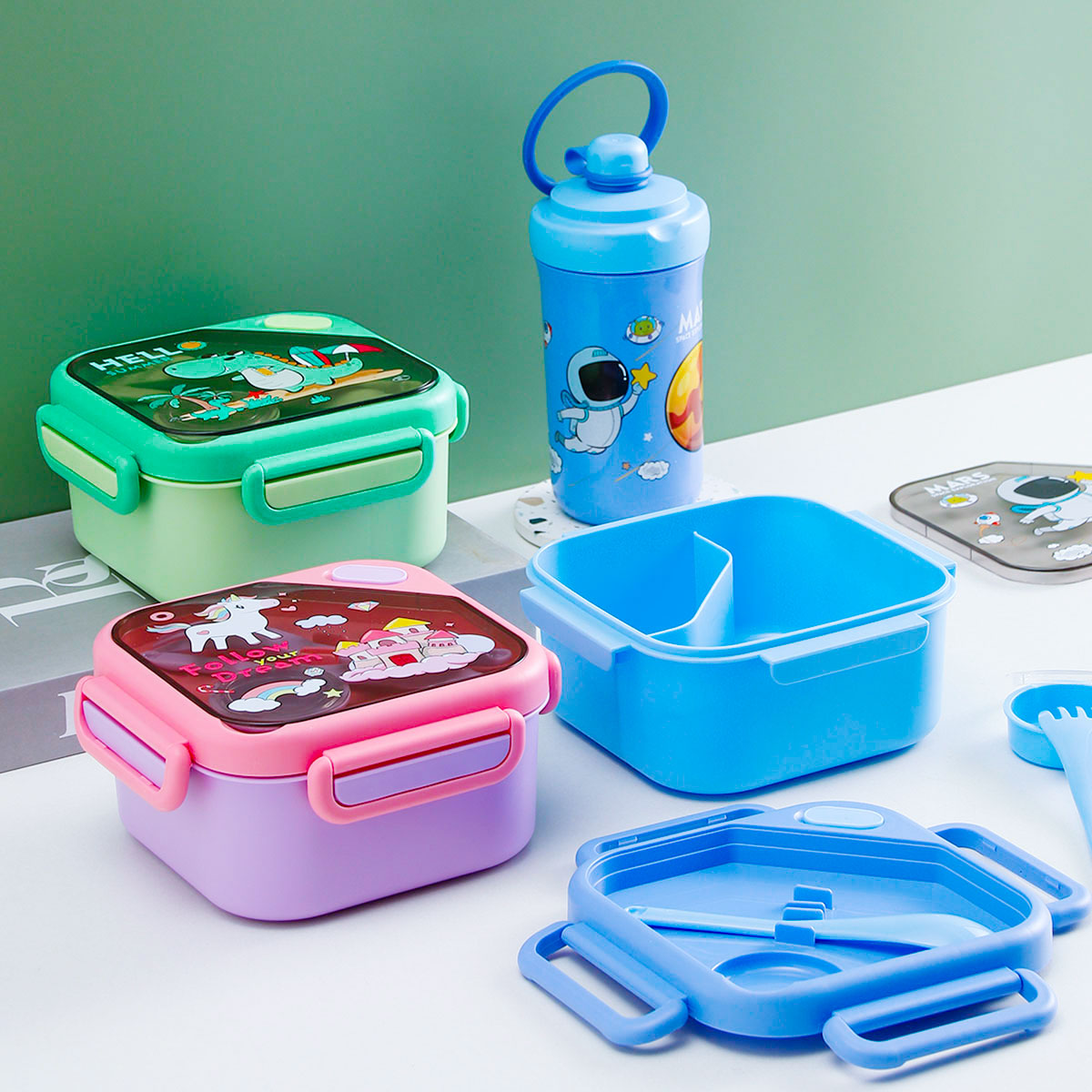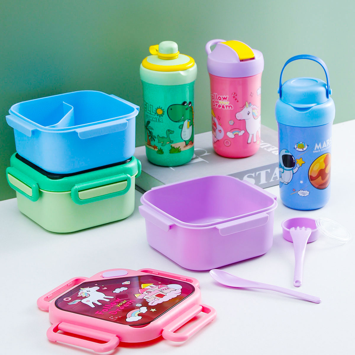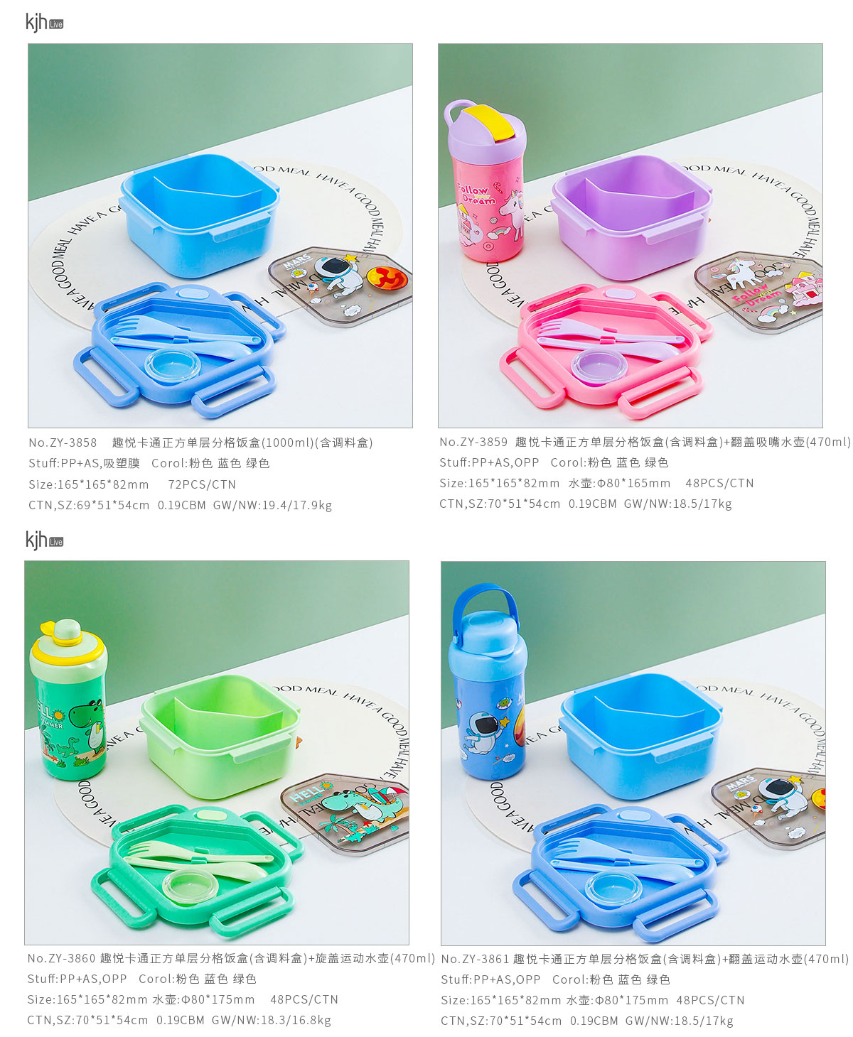 趣悅卡通正方單層/分格飯盒(含調(diào)料盒)+翻蓋吸嘴/旋蓋運動/翻蓋運動水壺