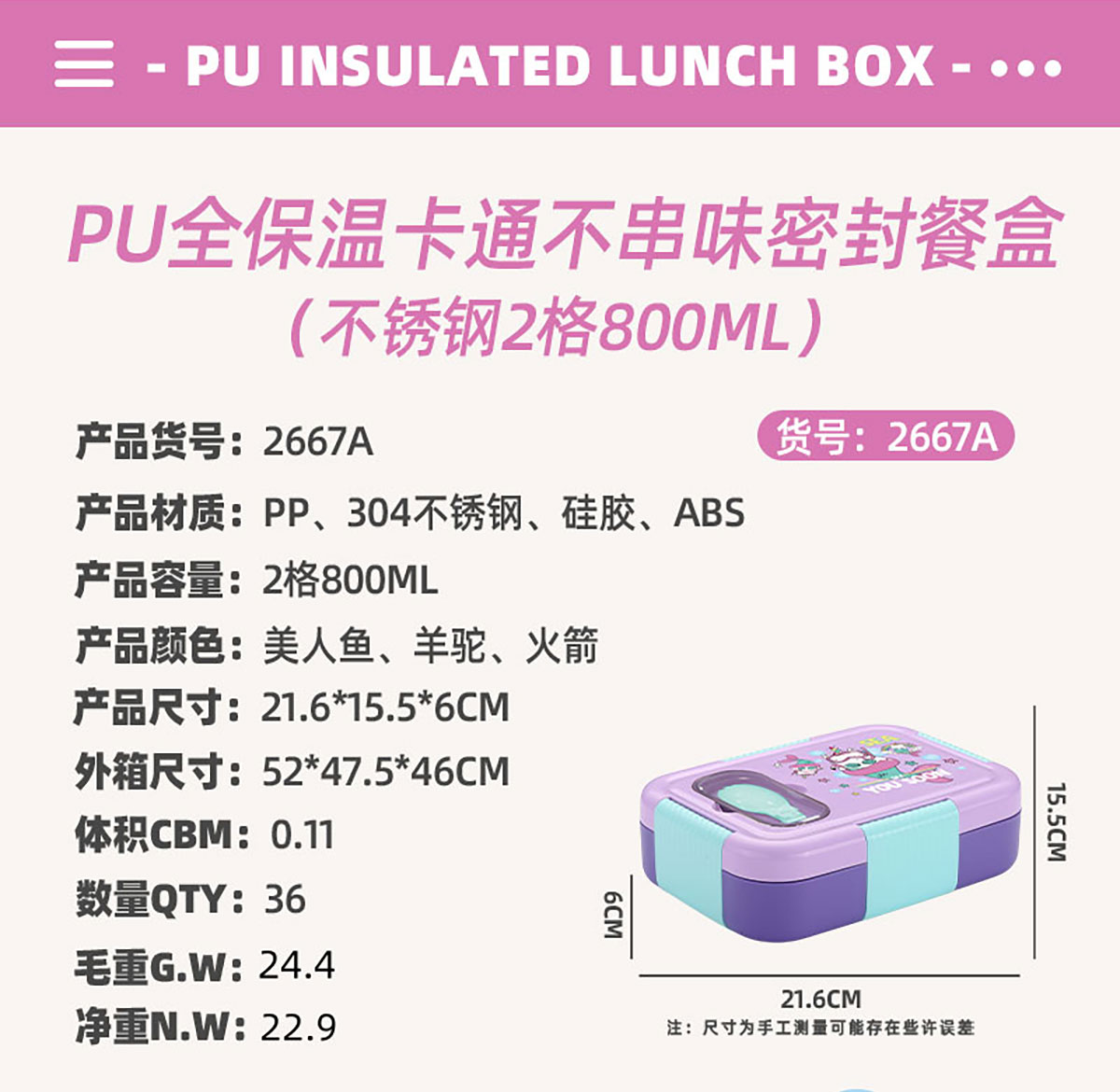 PU全保溫卡通不串味密封餐盒(卡通不銹鋼3格/2格+PP折疊勺)