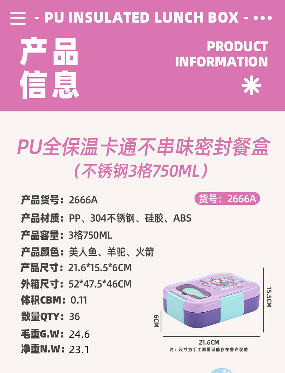 Size: AQX-2666A(3格):216*155*60mm/750ml